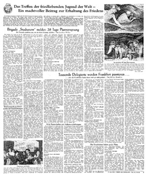 In zunehmendem Maße übernehmen viele Mitglieder und Kandidaten unserer Partei anläßlich der Überprüfung Verpflichtungen zur Mitarbeit und Unterstützung bei den Vorbereitungen zu den Weltfestspielen de...