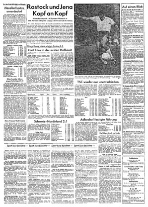 In der Berliner Stadtliga baute die SG Adlershof durch einen 3:2 (1 :0)-Sieg über Motor Weißensee ihren Vorsprung weiter aus. Die Tore schössen Rößler (2) und Wackwitz (Strafstoß) für Adlershof, währe...