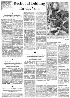 Berlin (ADN). Die unterschiedlichen Bildungsmöglichkeiten in beiden deutschen Staaten waren das Thema des traditionellen Sonntagsgesprächs im Deutschlandsender und dem Deutschen Fernsehfunk. Es nahmen...