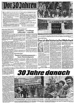 „Gegen 17.30 Uhr wurden sie zur Straße geführt^ den linken Arm mit einer schwarzrotgoldenen Binde neben dem damaligen Drei-Pfeile-Abzeichen der .Eisernen Front' — welches durch einen Stempel auf die S...