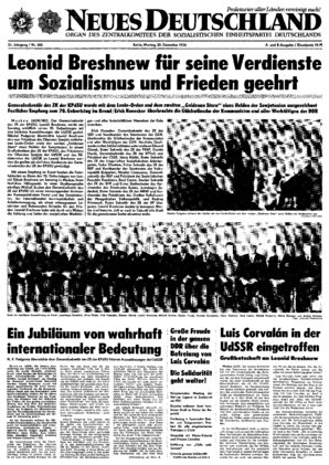 Moskau (ADN). Die höchste Auszeichnung der UdSSR, der Lenin-Orden, sowie die zweite Medaille „Goldener Stern" eines Helden der Sowjetunion ist dem Generalsekretär des ZK der KPdSU, Leonid Breshnew, am...