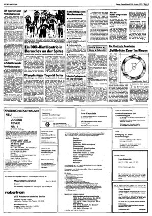 Zum Auftakt der internationalen Jugendwettkämpfe der Freundschaft im Biathlon am Donnerstag in Harrachov (CSSR) gab es im Wettbewerb über 15 km einen dreifachen DDR-Erfolg. Der 19jährige Jürgen Gründl...