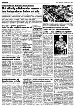 Der erste Monat des Jahres 1983 ist nun vorüber. Mit einem guten Planstart wurden vielerorts die Weichen für die Lösung der hohen Ziele im Karl-Marx-Jahr gestellt Viele Kollektive haben sich in ihren ...