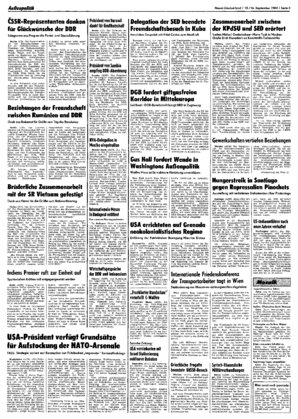Havanna (ADN). Die von Konrad Naumann, Mitglied des Politbüros und Sekretär des ZK der SED, geleitete Delegation der SED, die sich auf Einladung der KP Kubas vom 6. bis 14. September in Havanna aufhie...