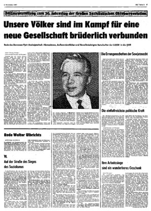 Lieber Genosse Ulbricht! t,iebe deutsche Freunde und Genossen! Gestatten Sie mir, werter Genosse Ulbricht, Ihnen vor allem für die freundlichen Glückwünsche, für die herzlichen Grüße und Worte der Fre...