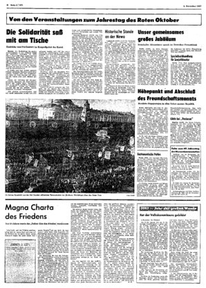 Um 9 Uhr abends tritt der II. Allrussische Sowjetkongreß zu seiner zweiten Sitzung zusammen. W, I. Lenin, der, um den Aufstand zu leiten, tags zuvor an den Beratungen nicht teilgenommen hatte, wird vo...