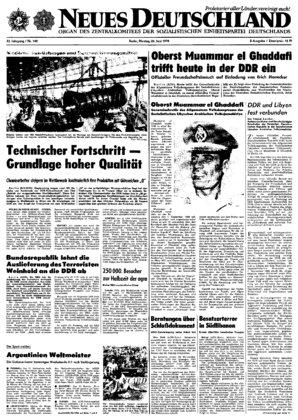 Berlin (ADN). Heute trifft der Generalsekretär des Allgemeinen Volkskongresses der Sozialistischen Libyschen Arabischen Volksjamahiriya, Oberst Muammar el Ghaddafi, zu einem offiziellen Freundschaftsb...