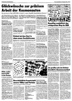 Berlin (ND/ADN). Das gemeinsame Kaumflugunternehmen UdSSR-DDR, besonders die erfolgreiche Ankopplimg von Sojus 31 an den Orbitalkomplex Salut 6/Sojus 29 war auch am Montag eines der Spitzenthemen der ...
