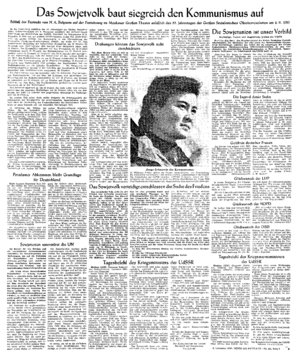Im Kampf für den Frieden und die internationale Zusammenarbeit unterstützt die Sowjetregierung alle Maßnahmen, die auf die Festigung der Organisation der Vereinten Nationen gerichtet sind, welche zu e...