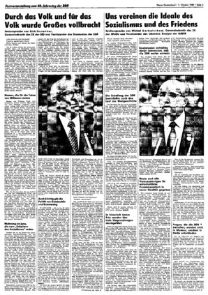 Liebe Freunde und Genossen! Verehrte ausländische Gäste! Meine Damen und Herren des Diplomatischen Korps! Vor 40 Jahren wurde der erste sozialistische Staat auf deutschem Boden, die Deutsche Demokrati...