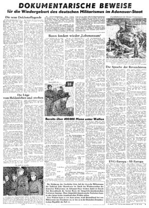 Unter Berufung auf die faschistische „Lebensraumtheorie" Hitlers weist die Zeitschrift „Geopolitik" (Heidelberg, März 1953, Heft 3) den westdeutschen Truppen folgende Aufgabe zu: „Das einzige, was die...