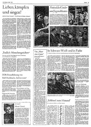 Greifswald (ND). Von den Vereinigten Bühnen Stralsund - Greifswald - Putbus wurde unter der Regie von Obenspielleiter Bruno Zieme am Sonntagabend Rolf Hochhuths Schauspiel „Der Stellvertreter" in Grei...