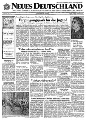 Tel Aviv (ADN-Korr.). Mit einem Schweigemarsch durch die Hauptstraßen Tel Avis forderten am Sonnabend — wie zum Teil schon kurz gemeldet — Tausende Einwohner, den Judenmörder Glpbke neben Eichmann auf...