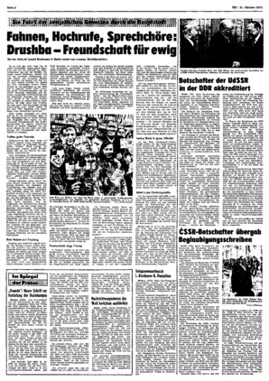 Feierlich und machtvoll zugleich klingen die Hymnen unserer beiden Staaten auf, intoniert von einem Musikkorps der Nationalen Volksarmee. Junge Pioniere, die Besten aus vielen Klassen der 14. Oberschu...
