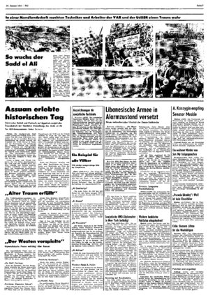 VAR würdigt uneigennützige Hilfe der Sowjetunion Kairo (ADN-Korr.). „Die Augen der Welt sind heute auf Assuan gerichtet", , „Sinnbild der ägyptisch-sowjetischen Freundschaft", „Historische Stunde für ...