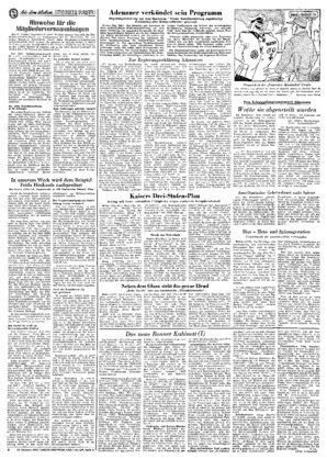 Bonn (Eis. Ber.). Am Dienstag gab Adenauer in einer mehrstündigen Regierungserklärung vor dem neuen Bundestag das aggressive Programm des deutschen Imperialismus bekannt, das in den kommenden vier Jah...