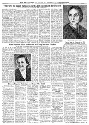 Teure Freunde! In ihrem interessanten und inhaltsreichen Referat hat Frau Eugenie Cotton das bedeutende Anwachsen der Kräfte des Friedens und des Fortschritts gezeigt, die fähig sind, die dunklen Kräf...