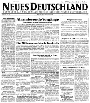 Der Boykott geht um. Die Kriegshetzer wollen verhindern, daß unsere sozialistische Presse, die Presse der wirklich demokratischen Friedensfreunde, in die Häuser und Haushalte des Westens gelangt. Wir haben alle die Pflicht, dieses zu verhüten. Kommt zu unseren Filialen, kommt zu den Ausgabestellen, kommt zu den Bahnhöfen, stellt Euch in Massen zur Verfügung, helft alle mit, daß am Sonntag in jedem Haus, in jeder Familie unsere Zeitungen gelesen werden ...