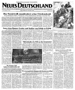 Die Sowjetunion hat mitgeholfen, die Grundlage der Entwicklung unserer Friedenswirtschaft zu bauen und hilft uns täglich das Leben weiter zu entfalten. Der Zweijahrplan unserer Friedenswirtschaft wurde vorfristig erfüllt dank der großen Leistungen unserer Aktivisten, Arbeiter, Techniker, Ingenieure und Wissenschaftler ...