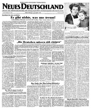 Nürnberg (ADN). Unter der Überschrift „Das deutsche Gespräch" nehmen die „Nürnberger Nachrichten" in einem Leitartikel zu den Perspektiven des Vorschlages von Ministerpräsident Otto Grotewohl Stellung. Das Blatt schreibt: „In einer Lage, in der für die ganze Welt die Entscheidung über Krieg oder Frieden ...