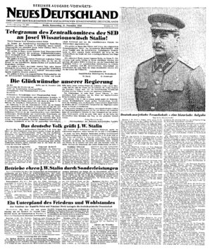 Genosse J. W. Stalin begeht heute seinen 71. Geburtstag. Zusammen mit den Völkern der Sowjetunion, der Volksdemokratien, zusammen mit allen fortschrittlichen Menschen der Welt grüßen auch Millionen Werktätige und fortschrittliche Menschen in Deutschland am heutigen Tage besonders herzlich Stalin, den besten Freund des deutschen Volkes ...