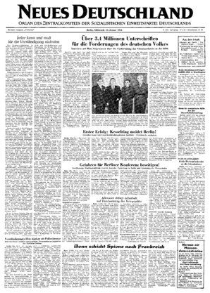 Die Bevölkerung Westdeutschlands wendet sich, wie das ganze deutsche Volk, immer entschiedener gegen die Versuche Adenauers, den erfolgreichen Verlauf der Viererkonferenz in Berlin zu vereiteln, wie das besonders deutlich die Ansetzung der Wehrdebatte für den 14. Januar zeigt. Diese Stimmung spiegelt sich auch in einer großen Zahl bürgerlicher Pressestimmen wider ...