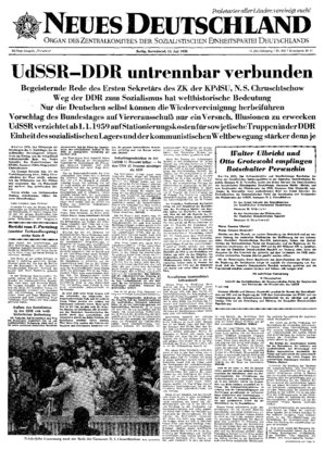 Berlin (ADN). Der Erste Sekretär des Zentralkomitees der Kommunistischen Partei der Sowjetunion, N. Si Chruschtschow, der am V Parteitag der Sozialistischen Einheitspartei Deutschlands teilgenommen hat, reiste wie vorgesehen am Freitag, dem 11. Juli, mit einem Flugzeug TU 104 von Berlin nach Moskau ab ...