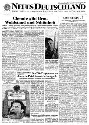 Warum die USA keinen Friedensvertrag mit Deutschland wollen Paris (ND).- Umfassende Maßnahmen zur noch schnelleren Ausrüstung aller europäischen NATO-Truppen mit Atomwaffen gab am Montag der Oberkommandierende der NATO - Streitkräfte in Europa, USA-General Norstad, auf einer Pressekonferenz in Paris bekannt ...