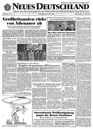 London /Berlin (ADN/ND). Die provokatorische Rede des Bonner Kanzlers vor dem Westberliner Abgeordnetenhaus, deren erklärtes Ziel es war, eine Einigung über Westberlin auf der Gipfelkonferenz zu hintertreiben, hat in zahlreichen Ländern eine scharfe Zurückweisung erfahren. Insbesondere in Großbritannien wurde der neue Ausfall Adenauers gegen die Entspannung mit einein Sturm der Entrüstung quittiert ...