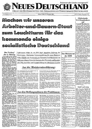 Mit ihren ersten Beschlüssen hat die Volkskammer begonnen, den Willen der Wähler zu vollziehen. Die1 Oberste Volksvertretung wählte ihrem demokratischen Mandat entsprechend einmütig Walter Ulbricht als Vorsitzenden des Staatsrates sowie die Mitglieder des Staatsrates. Sie bestätigte Otto Grotewohl einstimmig als Vorsitzenden des Ministerrates ' und Willi Stoph als seinen Ersten Stellvertreter ...