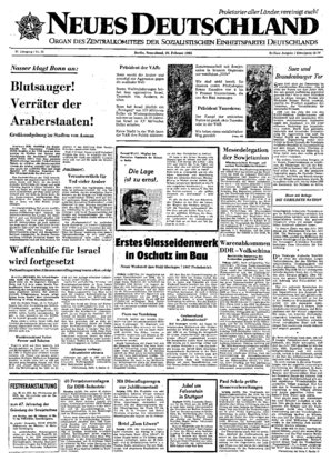 Ass-nan. (ND). Anläßlich des Staatsbesuchs des tunesischen Präsidenten Habib Burgiba in der VAR fand am Donnerstag im Stadion von Assuan eine Kundgebung der Arabischen Sozialistischen Union (ASU) statt. Eine jubelnde Menschenmenge begrüßte VAR-Präsident Nasser. Er erklärte, „die Bundesrepublik verrate die Araber, ermutige zur Aggression gegen die arabische-Welt und sauge Ägypten mit maßlosen Zinssätzen für ihre Wirtschaftshilfe das Blut aus" ...