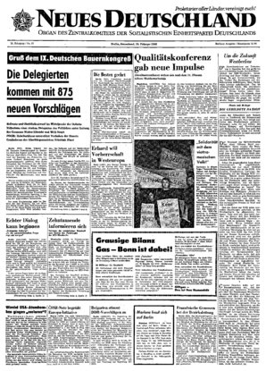 Berlin (SD); Heute beginnt der IX. Deutsche Bauernkongreß im Zentralen Klub der Jugend und Sportler in der Berliner Karl-Marx-Allee. Um 9.00 Uhr wird der Kandidat des .Politbüros, Genosse Gerhard Grüneberg, die große Bauernaussprache eröffnen. Eine starke Delegation des Politbüros des ZK unter Leitung von Genossen Walter Ulbricht, Erster Sekretär des ZK und Vorsitzender des Staatsrates, und Genossen Willi Stoph, Mitglied des Politbüros und Vorsitzender des Ministerratesj wird daran teilnehmen ...