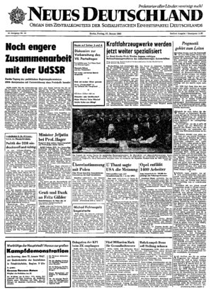 Proletarier aller Länder, vereinigt euch! Organ des Zentralkomitees der Soziaustischen Einheitspartei Deutschlands 22. Jahrgang / Nr. 13 Berliner Ausgabe / Einzelpreis 15 Pf Berlin, Freitag, 13. Januar 1967 f.l Werktätige der Hauptstadt1. Heraus zur großen Kampfdemonstration am Sonntag, dem 15. Januar 1967, zur Gedenkstätte der Sozialisten in Friedrichsfelde, Beginn: 9 Uhr Es spricht: Genosse Hermann Matern Mitglied des Politbüros des ZK Vor 4t Jahren, am 15 ...
