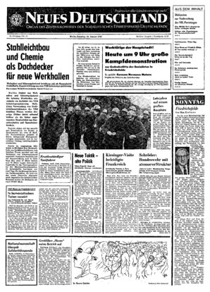 Die Kampfdemonstration zum 48. Jahrestag der Ermordung vort Karl Liebknecht und Rosa Luxemburg am Sonntag, dem 15. Januar, beginnt um 9 Uhr in der Frankfurter Allee zur Gedenkstätte der Sozialisten in Friedrichsfelde. Die führenden Persönlichkeiten der Deutschen Demokratischen Republik nehmen an der Spitze der Demonstration, in der Frankfurter Allee, an der Wartenbergstraße, Aufstellung ...