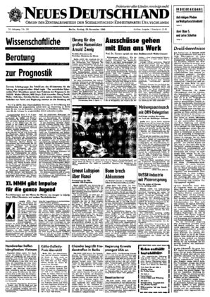 Genosse Alfred Neumann unterstrich, daß im 20. Jahr der Republik die Messebewegung planmäßig so weiterentwickelt werden müsse, wie das der Vorsitzende des Ministerrates, Genosse Willi Stoph, in seiner würdigenden Einschätzung der XI. MMM Anfang dieser Woche in Leipzig (ND vom 26. November) zum Ausdruck gebracht hatte ...
