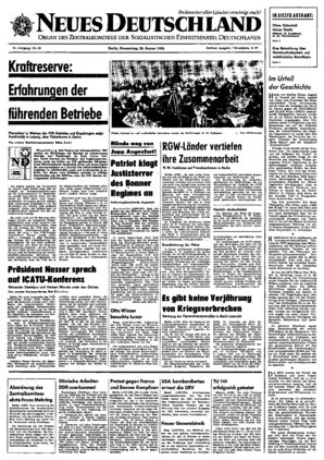 Berlin (ADN). Der Selbstmord von Jan Palach sei offensichtlich die Folge einer von bestimmten Westmächten und insbesondere dem nächsten westlichen Nachbarn der CSSR aufgezogenen Machenschaft. Er gehöre zum ständigen Plan mit dem Ziel, in der CSSR Agitation zu schaffen, um die notwendige Normalisierung zu verhindern,, erklärte in einem Exklusivinterview das Mitglied des ZK der KPC Vilem Novy der französischen Nachrichtenagentur Agence France-Presse ...