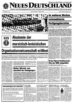 Die Berliner Wuhlheide hatte gestern ihr besonderes Ereignis: Am Vorabend des 20. Jahrestages der Republik eröffnete Genosse Walter Ulbricht die neugeschaffene Akademie der marxistischleninistischen Organisationswissenschaft. Der feierlichen Einweihung wohnten Mitglieder und Kandidaten des Politbüros ...