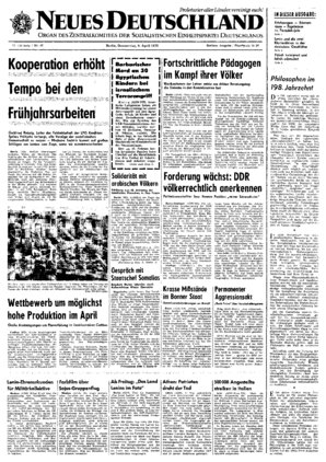 Berlin (ADN ND). An nahezu allen Universitäten und Hochschulen finden in diesen Wochen Studententage der FDJ statt. Sie sind" ein Höhepunkt im Lenin-Aufgebot des Jugendverbandes. Grundanliegen aller Veranstaltungen wird es sein, Bilanz über die Verwirklichung der 3. Hochschulreform zu ziehen. Während der 3 ...