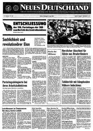 die Erfolge der DDR beim Aufbau des Sozialismus. Sie schätzt weiterhin die bedeutende Rolle, die die DDR als Faktor des Friedens und des Fortschritts in Europa und der ganzen Welt spielt. Getreu den Prinzipien des Marxismus- Leninismus und des proletarischen Internationalismus unterstützt die Sozialistische Einheitspartei Deutschlands die Völker Indochinas und alle Völker, die gegen den Imperialismus, für ihre nationale Unabhängigkeit kämpfen ...