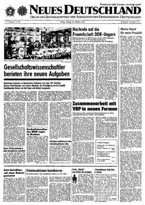 Berlin (ADN). Über den Besuch einer Delegation des ZK der USAP in der DDR wurde folgendes Kommunique veröffentlicht: Auf Einladung des Zentralkomitees der SED weilte vom 11. bis 14. Oktober 1971 eine Delegation des Zentralkomitees der Ungarischen Sozialistischen Arbeiterpartei unter Leitung des Mitgliedes des Politbüros und Sekretärs des Zentralkomitees Bela Biszku in der Deutschen Demokratischen Republik ...