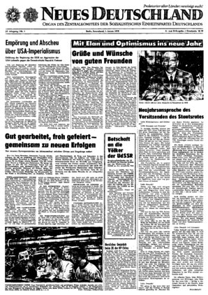 Berlin (ADN). Den fahrenden Persönlichkeiten der Deutschen Demokratischen Republik gingen zum Jahreswechsel zahlreiche in herzlichen Worten gehaltene Glückwünsche aus dem Ausland zu. Der Erste Sekretär des Zentralkomitees der Sozialistischen Einheitspartei Deutschlands, Erich Honecker, erhielt Neujahrsglückwünsche vom Generalsekretär des Zentralkomitees der Kommunistischen Partei der Sowjetunion, L ...