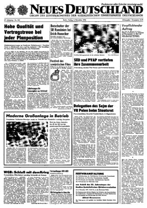 Auf der 8. Tagung der Bezirksleitung der SED Berlin am 2. November sprach der 2. Sekretär der Bezirksleitung, Helmut Müller, über „Die Aufgaben in Auswertung der 7. Tagung des Zentralkomitees, die notwendigen Maßnahmen zur Erfüllung des Volkswirtschaftsplanes 1972 und die Vorbereitung des Volkswirtschaftsplanes 1973" ...