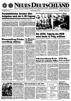 Tel Aviv (ADN). Der von Israel am S. Juni 1967 entfesselte Aggressionskrieg war auf die Unterdrückung der arabischen nationalen Befreiungsbewegung, auf die Einengung der legitimen Rechte des arabischen Volkes von Palästina und auf Eroberung fremden Territoriums gerichtet. Das wird in einem Appell des ZK der KP Israels zum sechsten Jahrestag der israelischen Juni-Aggression gegen die arabischen Länder festgestellt ...