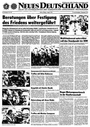 Berlin (ND). Das Fernsehen der DDR berichtet am Freitag, dem 1. August 1975, im I. Programm zu folgenden Zeiten von der europäischen Sicherheitskonferenz: 11.50 Uhr: Nachrichten mit Berichten von der Vormittagssitzung in Helsinki; 15.40 Uhr: Studio Helsinki, Direktübertragung von der Abschlußsitzung der Konferenz über Sicherheit und Zusammenarbeit in Europa; 18 ...
