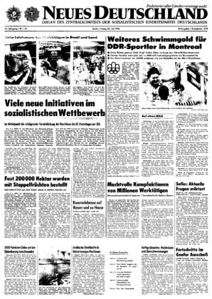 Neues Deutschland / 23. Juli 1976 / Seit« 7 Q5^P XXI. Olympische Sommerspiele 1976 Zitiert Semedelsko Sname Die bulgarische Zeitung „Semedelsko Sname" schreibt: „In diesen Tagen rufen ein gewaltiges Interesse die Wettkämpfe im Turnen und Schwimmen hervor. Zweifelsohne hinterlassen den stärksten Eindruck die DDR-Schwimmerinnen, an der Spitze mit Kornelia Ender, die außerordentliche Leistungen vollbrachte ...