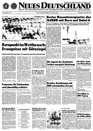 Wien (ADN). Die Beziehungen zwischen Österreich und der DDR hätten sich in letzter Zeit gut entwickelt, erklärte der österreichische Bundeskanzler Bruno Kreisky vor Vertretern des Verbandes der Auslandspresse in Wien. Bei seinem Besuch in der Deutschen Demokratischen Republik wolle er vor allem über den Ausbau der wirtschaftlichen Zusammenarbeit sprechen ...