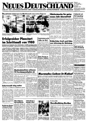 Berlin (ADN). Der Generalsekretär des ZK der SED und Vorsitzende des Staatsrates der DDR, Erich Honecker, und der Generalsekretär des ZK der KPdSU und Vorsitzende des Präsidiums des Obersten Sowjets der UdSSR, Leonid Iljitsch Breshnew, tauschten anläßlich des Jahreswechsels die herzlichsten Grüße und Wünsche für das Jahr 1980 aus ...