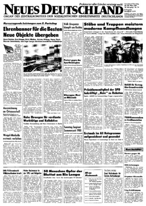 Redaktion und Verlag 1017 Berlin, Franz-Mehring-Platz 1, Telefon: 58 50 (Sammelnummer). Abonnementspreis monatlich 3.50 Mark 36. Jahrgang / Nr. 74 B-Ausgabe Einzelpreis 15 Pf w^ Proletarier aller Lander, vereinigt euch! ues Deutschland Sonnabend / Sonntag, ^m T" 2B.I29. März 1981 ORGAN DES ZENTRALKOMITEES DER SOZIAUSTISCHEN EINHEITSPARTEI DEUTSCHLANDS 5-kg-GoIdklumpen Irkutsk ...