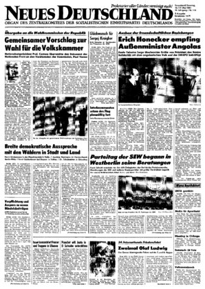 Berlin (ADN). Der Generalsekretär des ZK der SED und Vorsitzende des Staatsrates der DDR, Erich Honecker, empfing am Freitag den Minister für Auswärtige Angelegenheiten der Volksrepublik Angola, Paulo Teixeira Jorge, zu einem freundschaftlichen Gespräch. Paulo Teixeira Jorge überbrachte herzliche Grüße des Präsidenten der MPLA-Partei der Arbeit "und Präsidenten der Volksrepublik Angola, Jose Eduardo dos Santos ...