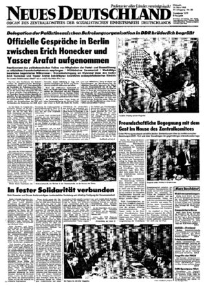 Berlin. Der Generalsekretär des Zentralkomitees der Sozialistischen Einheitspartei Deutschlands und Vorsitzende des Staatsrates der Deutschen Demokratischen Republik, Erich Honecker, und der Vorsitzende des Exekutivkomitees der PLO und Oberbefehlshaber der Streitkräfte der Palästinensischen Revolution, Yasser Arafat, führten am Dienstagnachmittag im Hause des Zentralkomitees der SED einen" ersten Meinungsaustausch zu Fragen der bilateralen Beziehungen und Grundfragen der internationalen Lage ...
